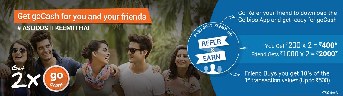 - Your friend signs up using your referral code on mobile app, you get Rs. 400* goCash and your friend gets Rs. 2000* goCash
